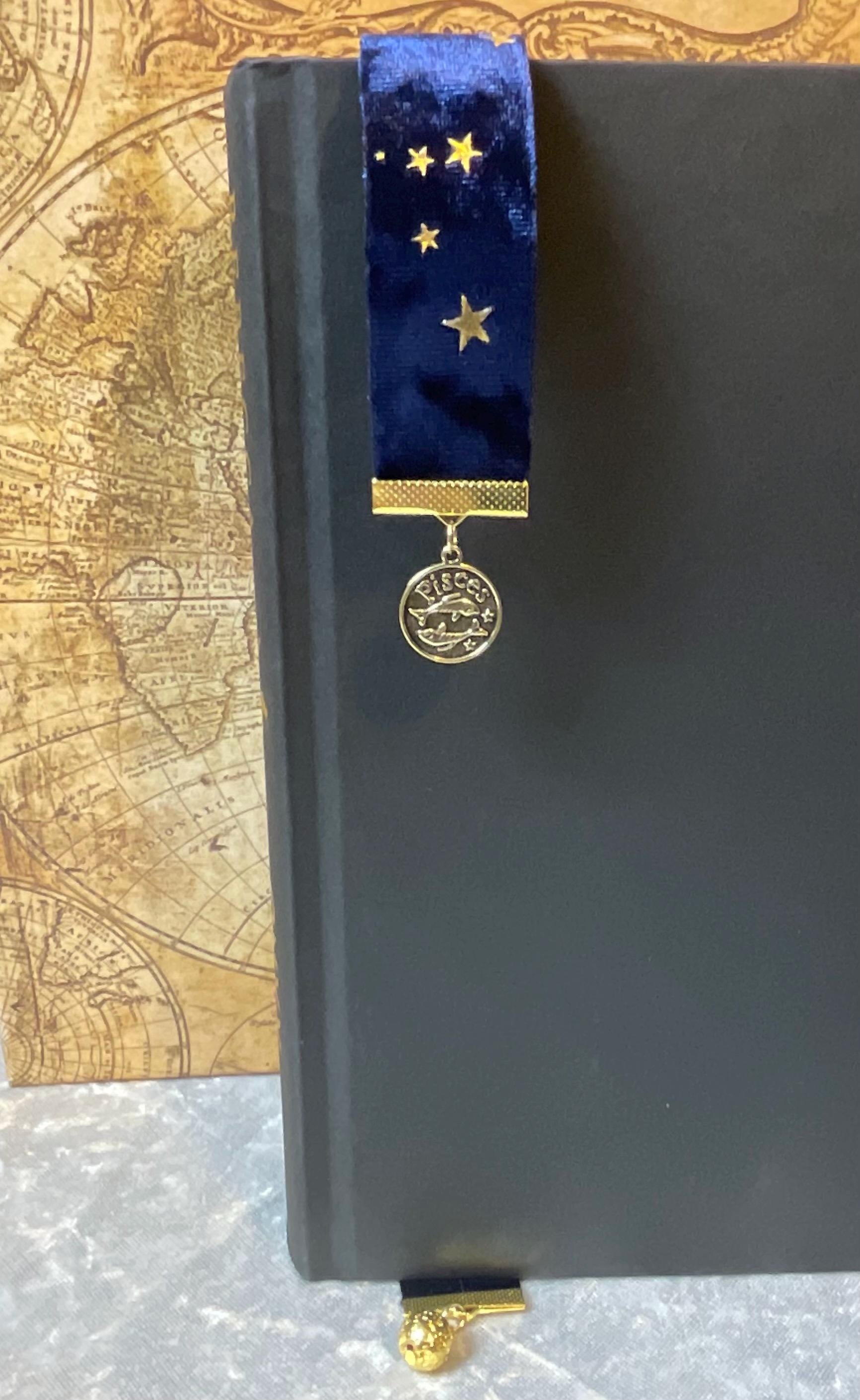 This handmade Pisces Zodiac Bookmark combines durable star-patterned velvet with metal charms and natural stone beads. The deep blue velvet reflects the water element of Pisces. Its thoughtful design offers both beauty and resilience, making it a meaningful companion for your reading moments and a charming decoration to your book shelves.